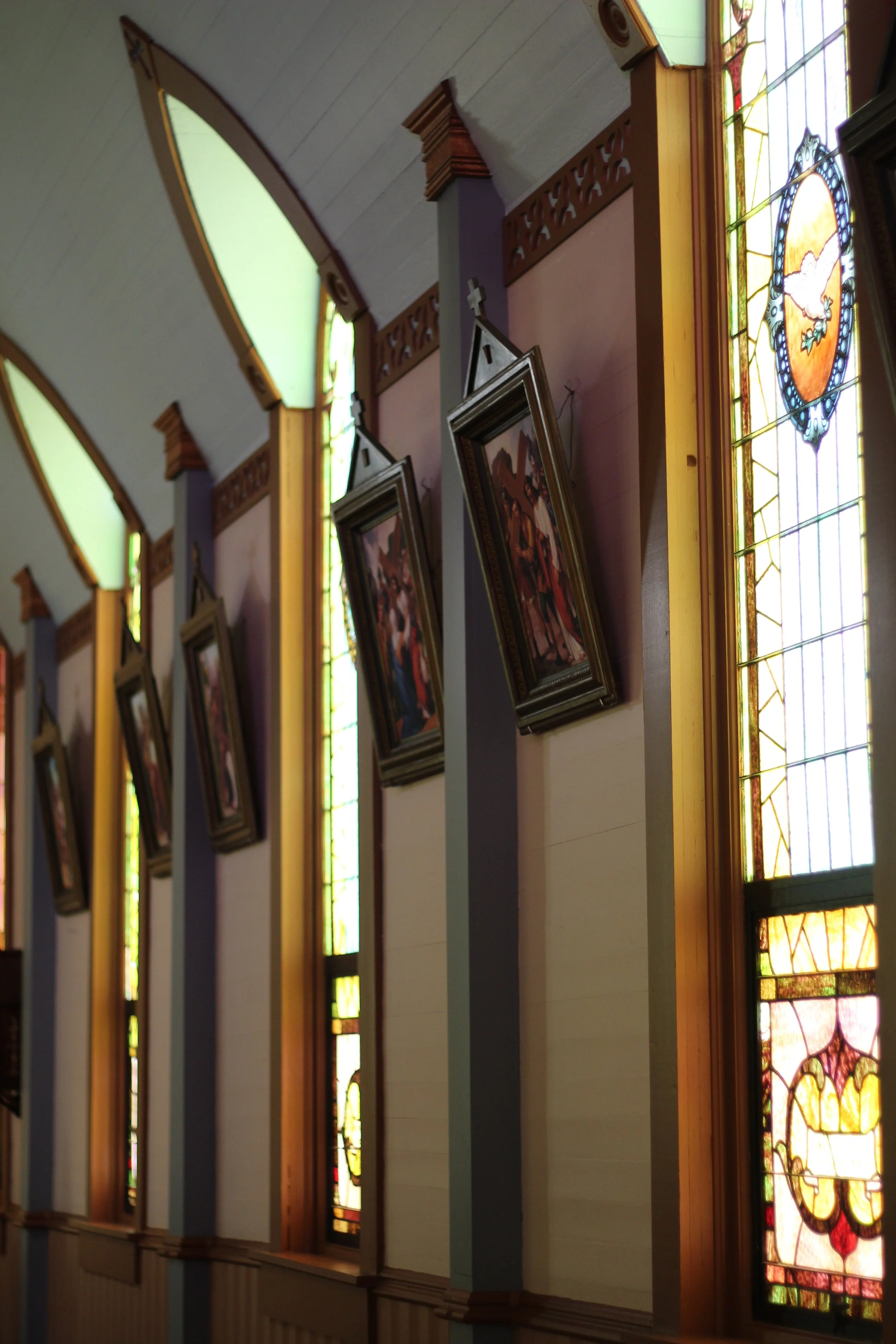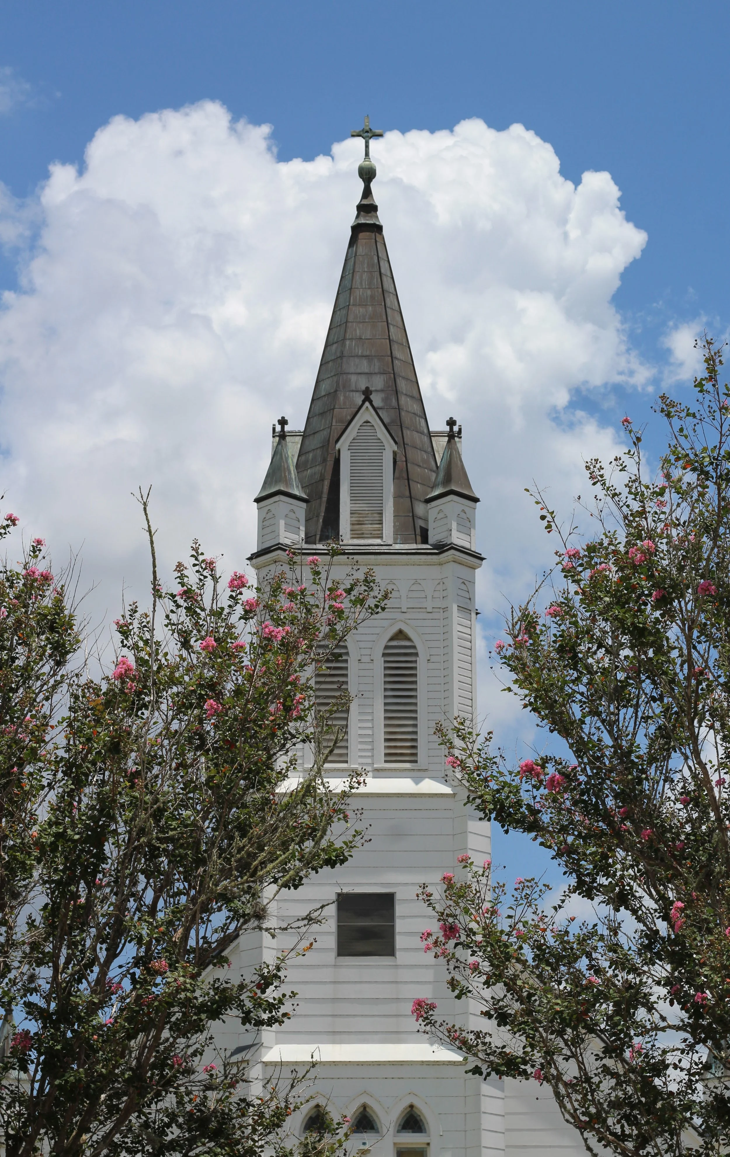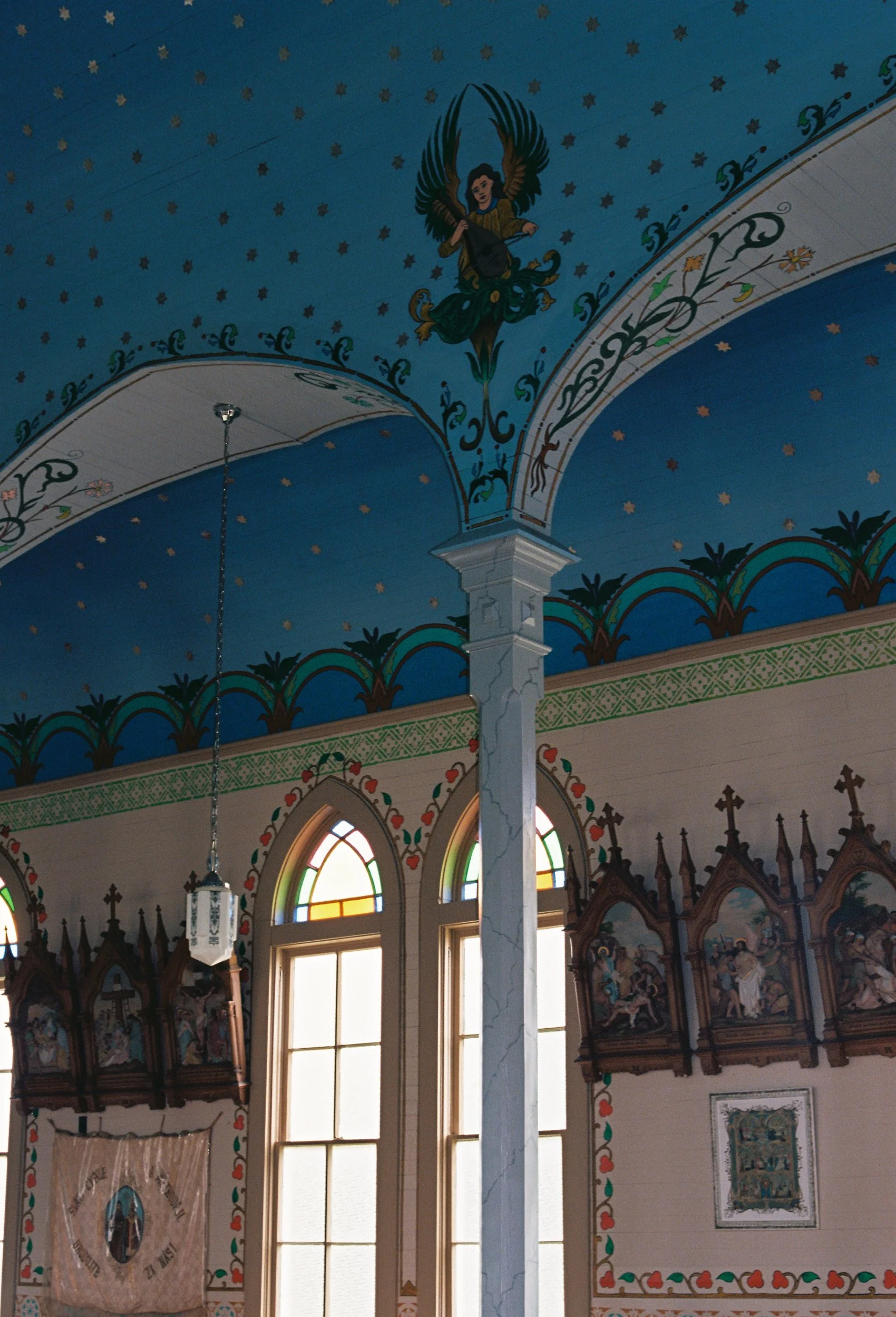 The next church was St. John the Baptist Catholic Church, which is known as the pink church. Previously two other churches occupied the site, with the first being destroyed by a hurricane and the second being burnt down; the current one was completed in 1919. This church is directly next to its graveyard and has a white wooden exterior. The interior is all a muted light pink with simpler windows and paintings than we had seen in the previous churches. The paintings include stenciling, infill, freehand, and marbling techniques that are seen in the floral patterns, draped garlands, interwoven circles, and multicolored geometric designs. Above the altar are two small cherubs flanking a chalice, palm fronds, and blossoms, with St. John featured in the altar. The Gothic Revival architecture style is seen through the polygonal apse, soaring spire, tall bell tower, corner buttresses, steep-pitched ventilation dormers, and lancet windows.