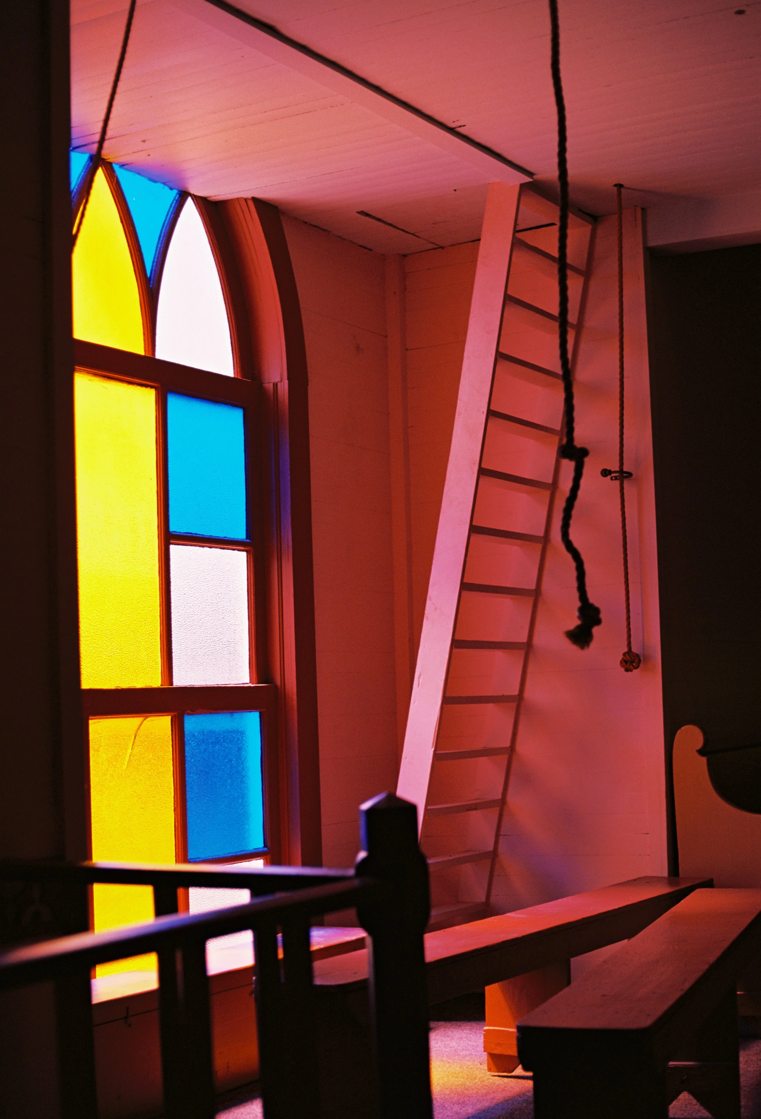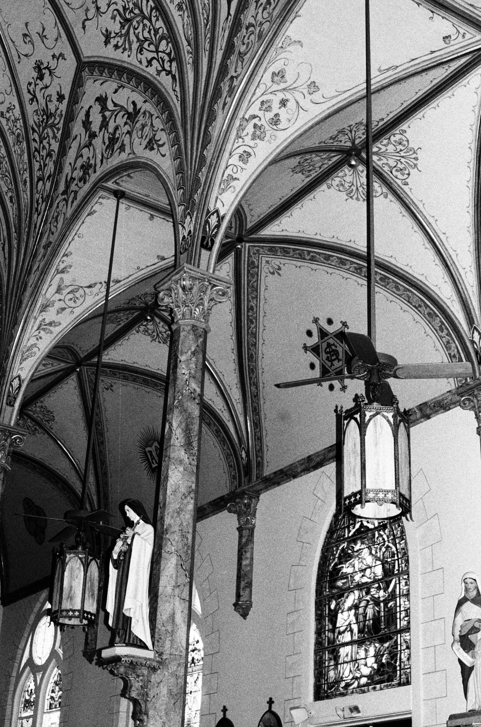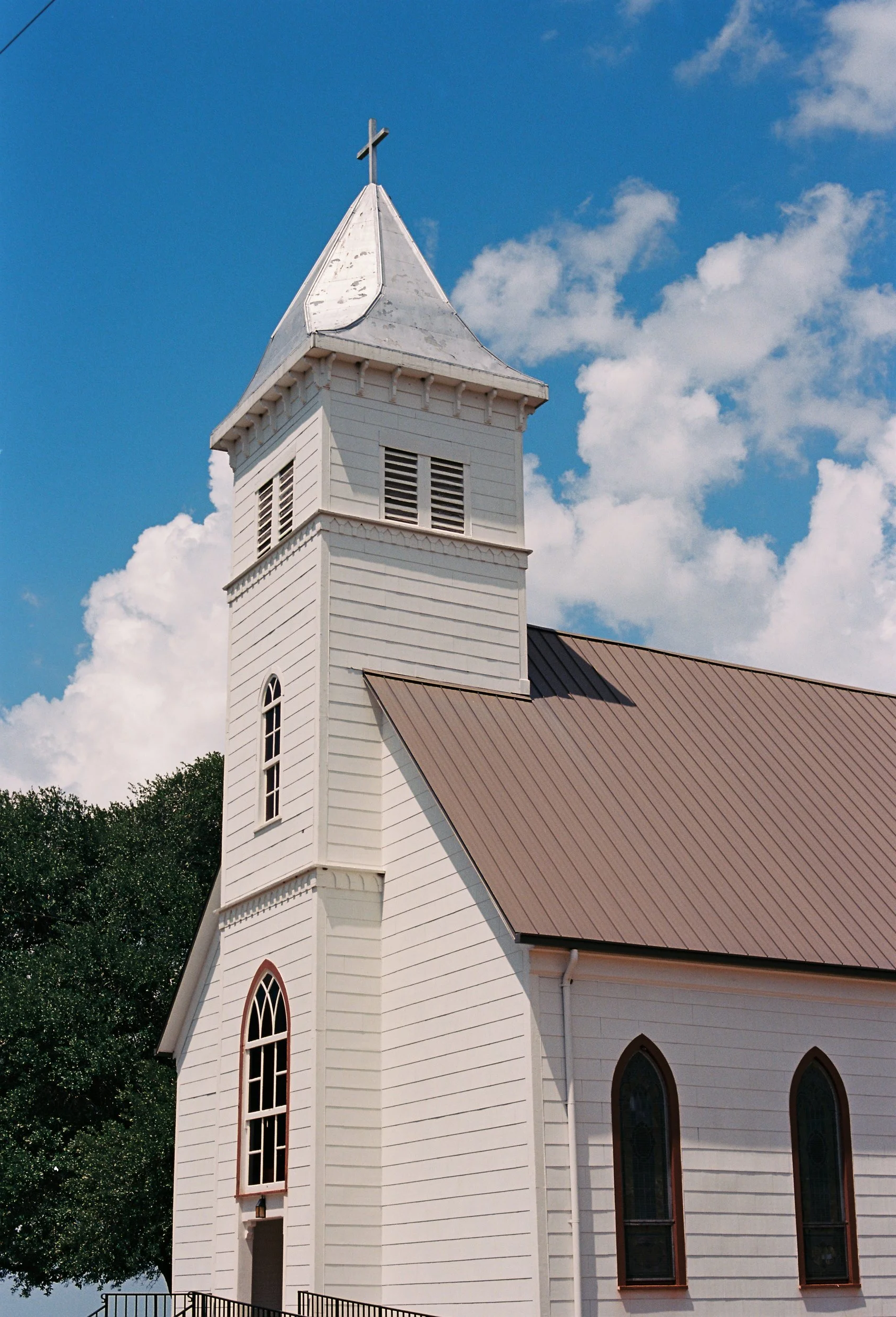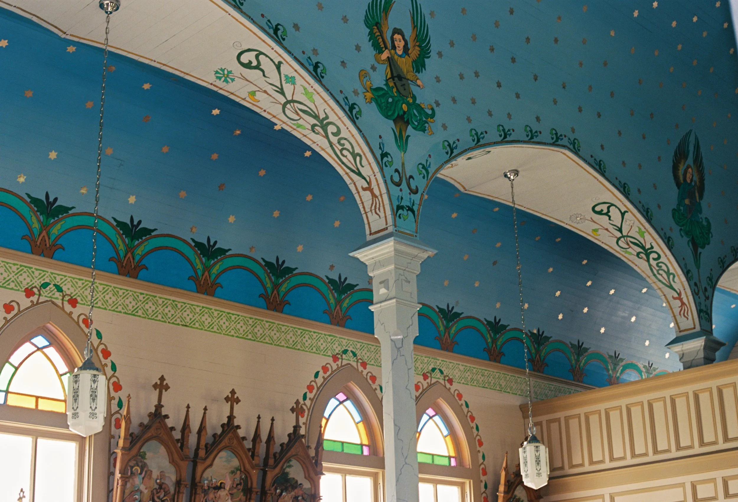 The next church was St. John the Baptist Catholic Church, which is known as the pink church. Previously two other churches occupied the site, with the first being destroyed by a hurricane and the second being burnt down; the current one was completed in 1919. This church is directly next to its graveyard and has a white wooden exterior. The interior is all a muted light pink with simpler windows and paintings than we had seen in the previous churches. The paintings include stenciling, infill, freehand, and marbling techniques that are seen in the floral patterns, draped garlands, interwoven circles, and multicolored geometric designs. Above the altar are two small cherubs flanking a chalice, palm fronds, and blossoms, with St. John featured in the altar. The Gothic Revival architecture style is seen through the polygonal apse, soaring spire, tall bell tower, corner buttresses, steep-pitched ventilation dormers, and lancet windows.