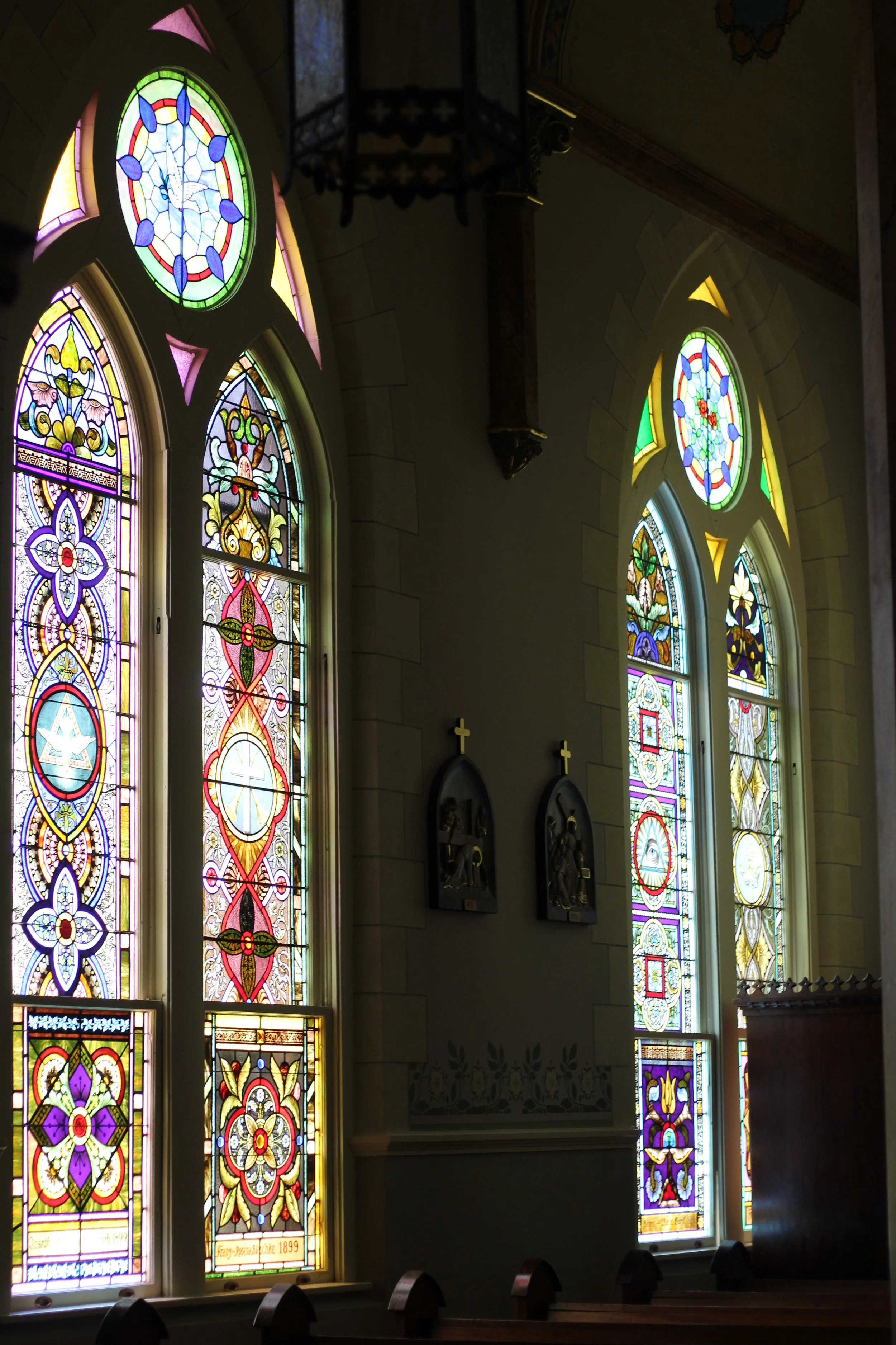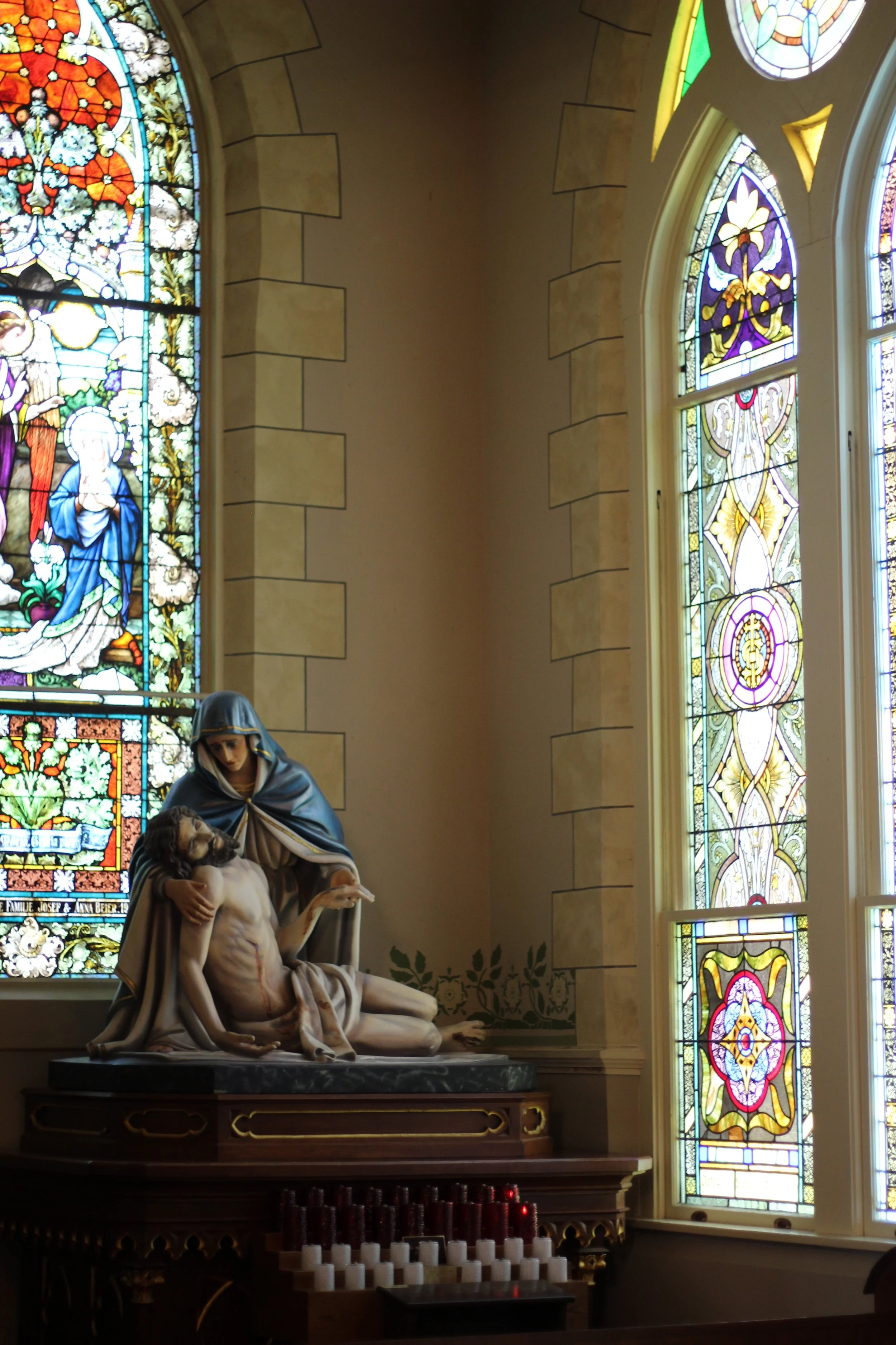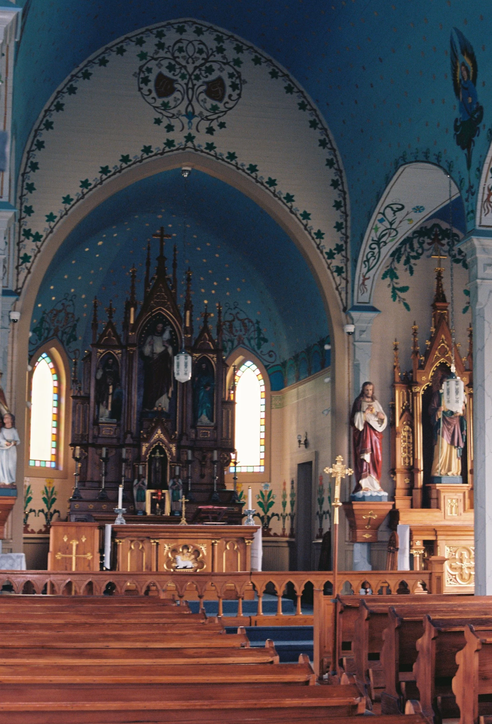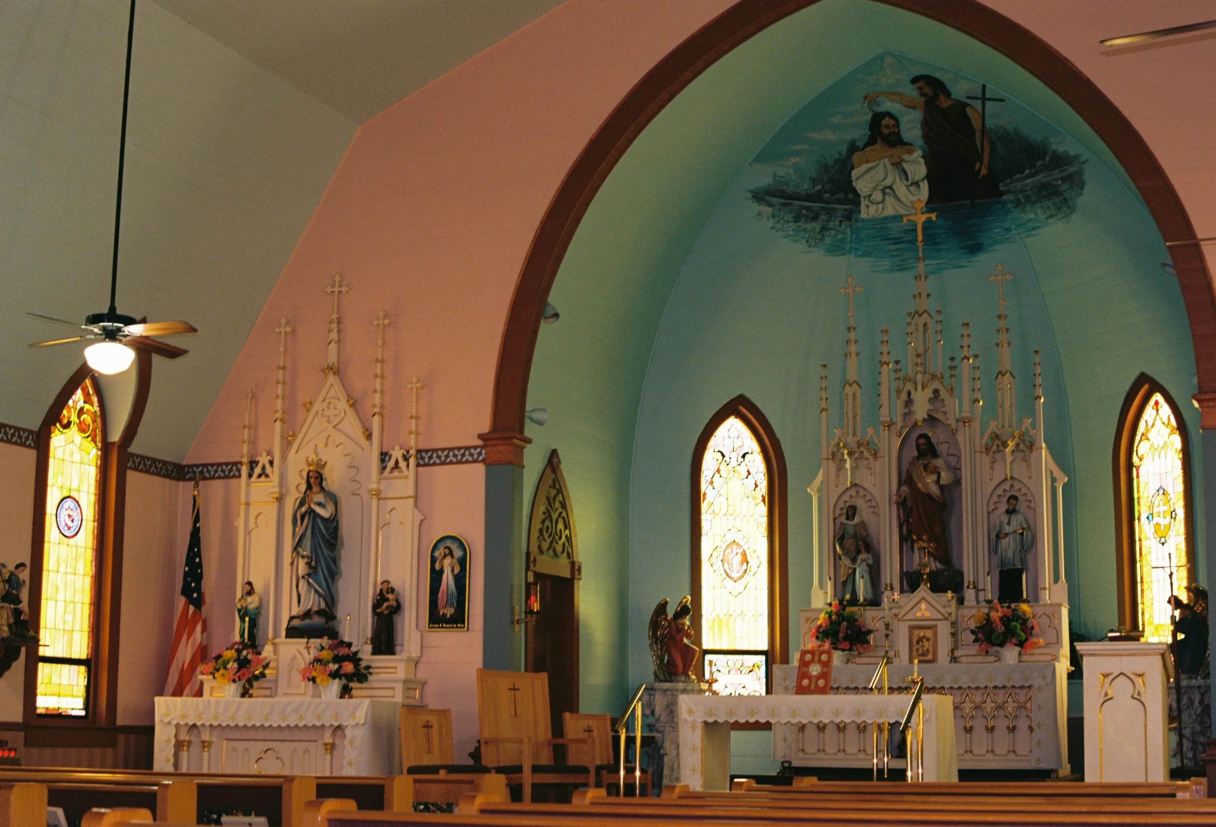 The final church we went inside of was St. John the Baptist German Catholic Church in St. John. This church was one that had not come up in my research before my trip to the churches, so I was surprised when we went inside. This was a smaller yet still beautiful pink and blue church with a large painting of St. John the Baptist baptizing Jesus above the altar. This small church was flooded with warm light from the stained glass, which spread a warm glow across the wooden benches and walls. It was on the simpler side but still had aspects of the extravagant churches, such as stained-glass windows, intricate Stations of the Cross, and a beautiful altar.