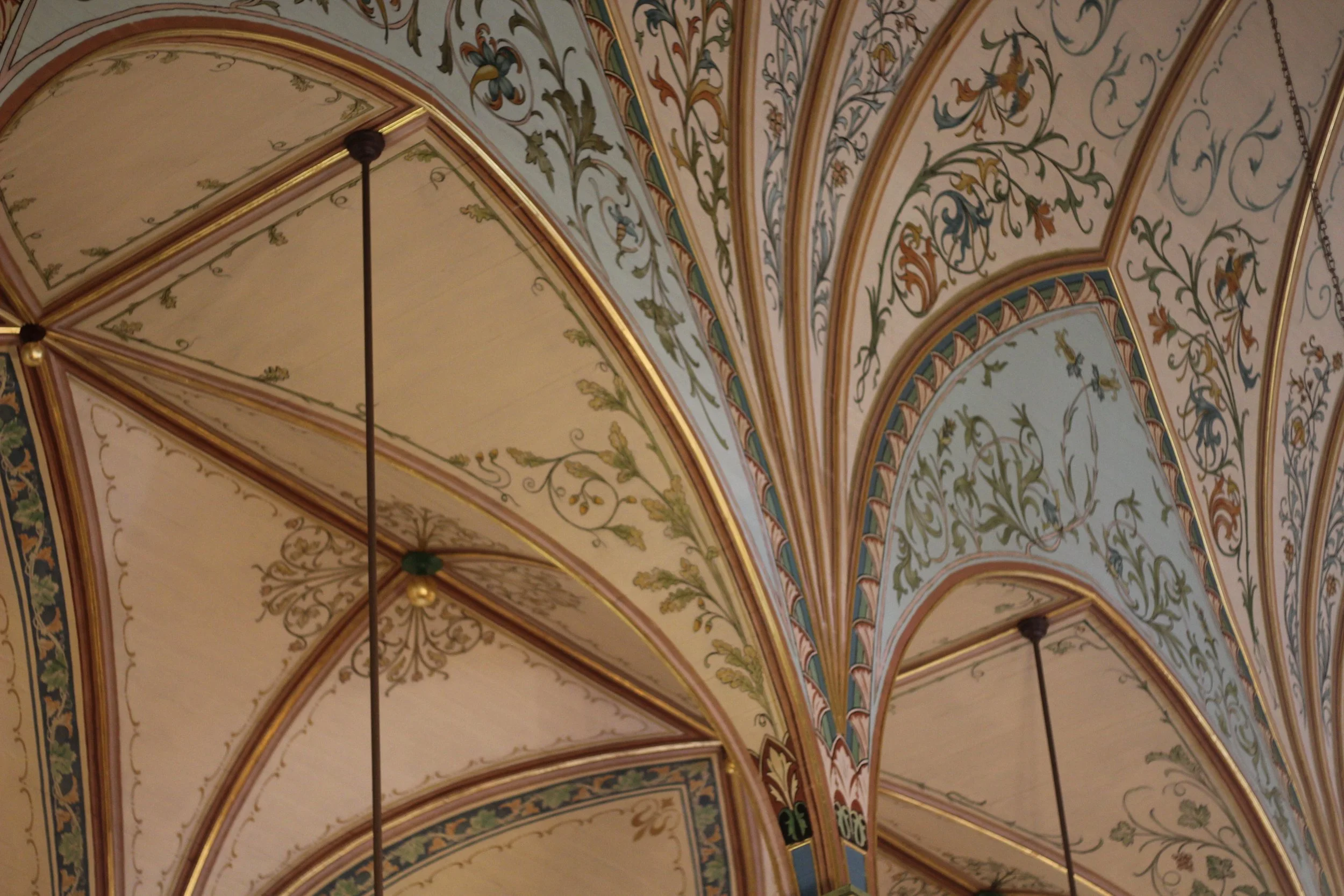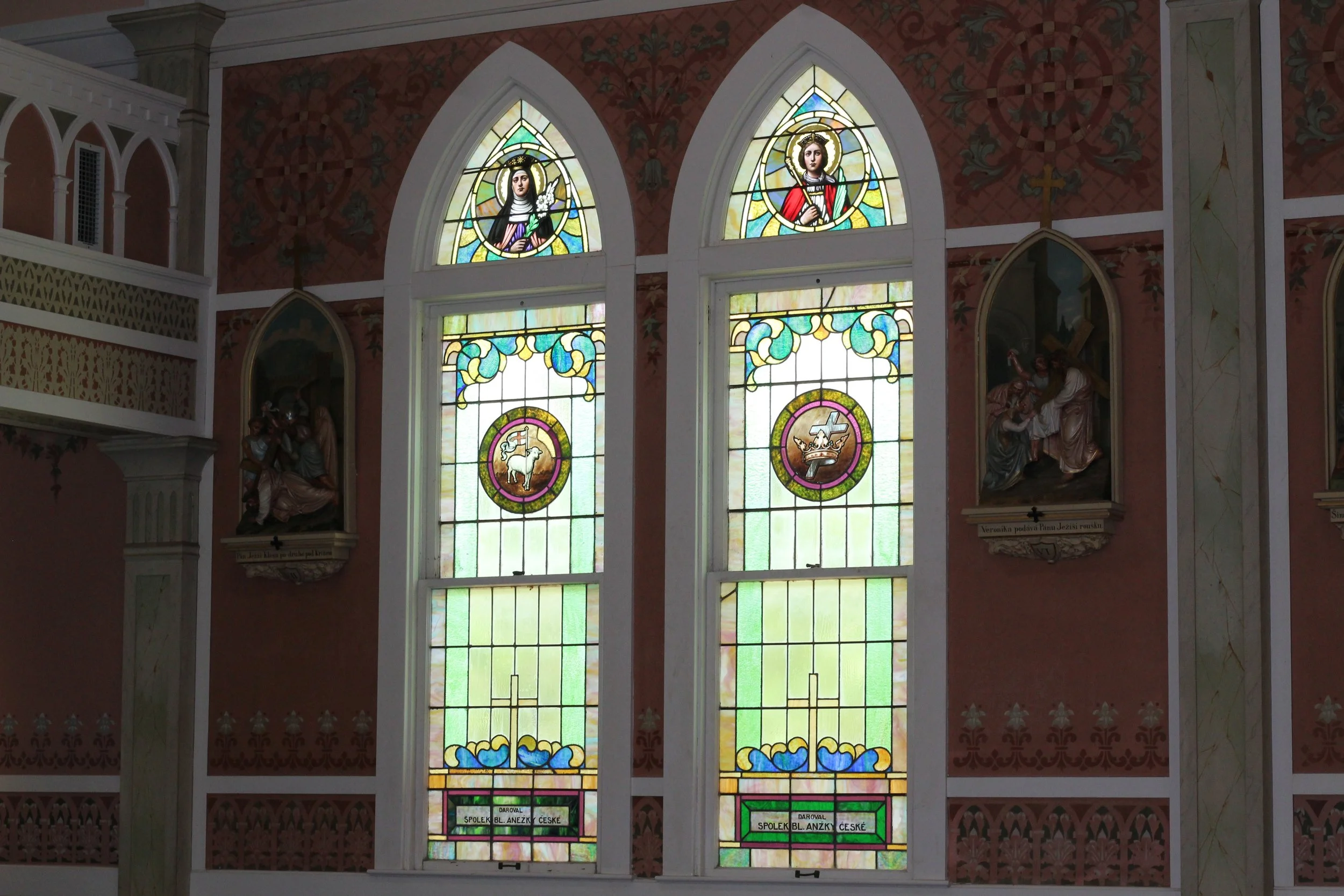 The main architecture style of these painted churches is Gothic Revival architecture. This style became popular between the 1840s and 90s. It is defined by a high-pitched roof, cross gabling, pointed arch windows, stained glass, and complex shapes. These types of buildings are typically thin and delicate to let as much light in as possible. The element of light is thought to reflect the truth of God and be the closest thing to heaven on earth. Stained glass windows reflect colored light when sun hits them, creating a beautiful colorful glow around the building. This style of architecture is popular in churches, houses, and public buildings. It is associated with European ecclesiastical architecture and romantic medieval styles from the 1700s. Gothic cathedrals were common in Europe because they were linked to the power of the Medieval Catholic Church. It became popular in the Northeast United States, particularly through the architecture of Alexander Jackson Davis and his 1st American Gothic house, built in 1832. He also promoted Gothic architecture through publications, public speaking, and books. This type of architecture was chosen for the painted churches because the architecture reminded immigrants of their homelands, such as the Old New Synagogue, Stone Bell House, St. Vitus Cathedral, and Old Town Bridge Tower.