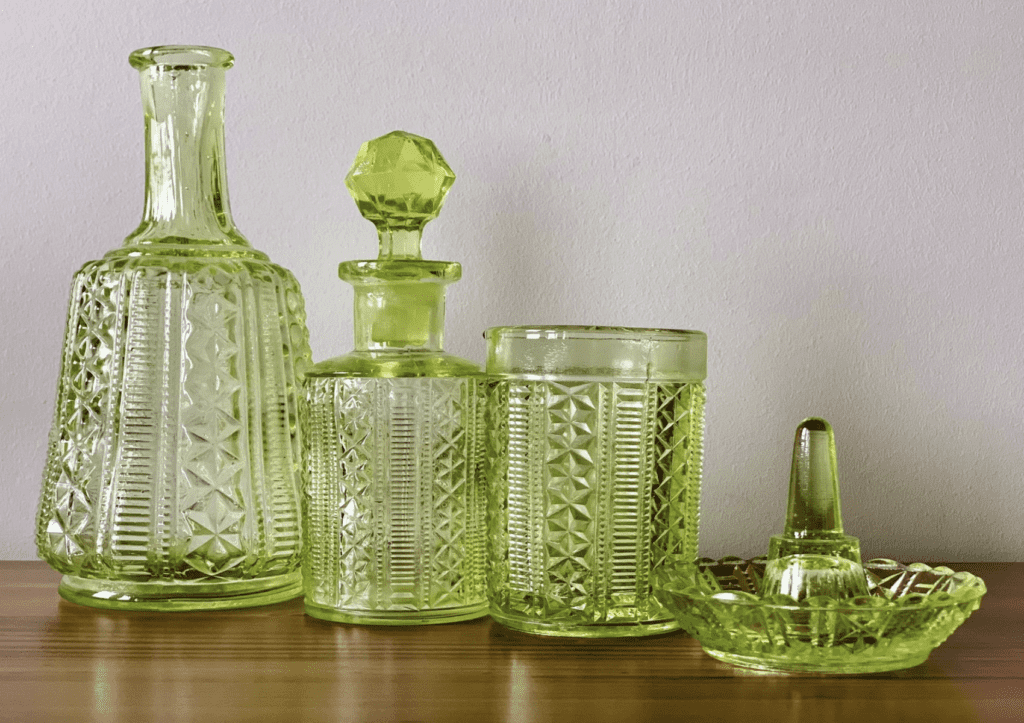 Some other names and types of uranium glass are Depression, Canary, Vaseline, and Burmese glass. They all share a similar yellow-green glow, but they originate from different locations and different time periods. For example, Canary glass has a more yellow tint and was produced in England starting from the late nineteenth century, and Depression glass was produced during the 1930s during the Great Depression.